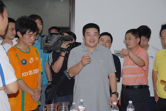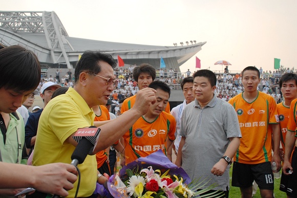 比赛一结束,球队的冠名赞助商暨战略合作伙伴——爱国者的总裁冯军先生就兴奋地跑向队员中,代表华旗的1900人向金指导献花,并向金指导和学生军们表示了热烈的祝贺。值得一提的是今天是冯军先生的生日,在这个重要而特殊的日子,他携亲友和华旗的员工一起来为爱国者大学生队加油助威,冯军先生说今天队员们的优异表现是他收到的最好的生日礼物。爱国者大学生队顽强拼搏,不畏强敌,坚持到最后一分钟,永不言败,永不服输。这正与爱国者的企业信念是一脉相承的。作为学生军的冠名方和战略合作伙伴爱国者,在中甲开赛以来的每场比赛中都给予了学生们极大的安慰和鼓励。无论是主场还是客场,他们都组织了强有力的助威阵容,为场上的队员们摇旗呐喊,无论输赢,他们都是那样热烈地鼓舞着他们的球队,为他们加油。他们说,因为我们是一个大团队,我们要相互支持和鼓励。