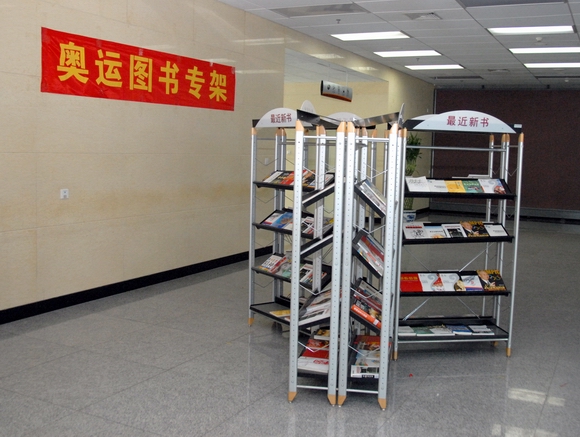 “奥运图书专架”的图书涉及奥运知识、奥运礼仪、奥运英语、奥运人物、奥运竞赛规则、奥运志愿者读本等类别。