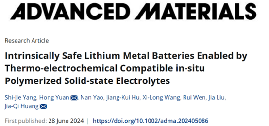 论文详情:Shi-Jie Yang, Hong Yuan*, Nan Yao, Jiang-Kui Hu, Xi-Long Wang, Rui Wen, Jia Liu, Jia-Qi Huang*. Intrinsically Safe Lithium Metal Batteries Enabled by Thermo-electrochemical Compatible In-situ Polymerized Solid-state Electrolytes, Adv. Mater. 2024, 2405086.