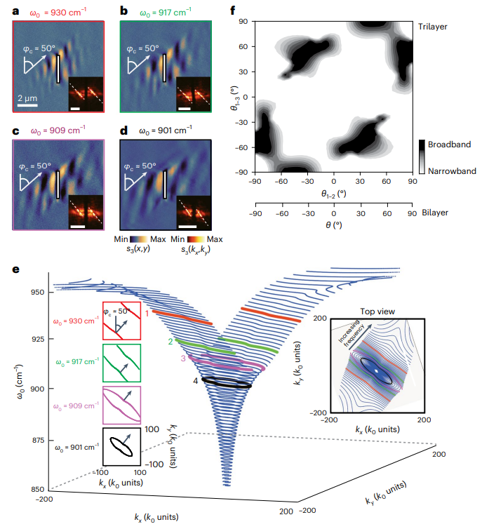 除此之外,理论研究还表明,三层转角氧化钼晶体中极化激元等频线可以在很宽的频率范围(870 cm-1-940 cm-1)内表现为平行直线(无衍射传播)。如图4所示,研究人员采用s-SNOM获得了不同入射光频率下三层转角氧化钼晶体的近场光学图像。当入射光频率从901 cm-1变化至930 cm-1时,近场光学图像与理论预言一致:金纳米天线激发的极化激元表现为沿着φc=""50°的方向高度定向传播(无衍射损耗)。这说明在三层转角氧化钼晶体中光学魔角具有光谱鲁棒性,可以在宽光谱范围内实现红外纳米光场的高度定向传播。